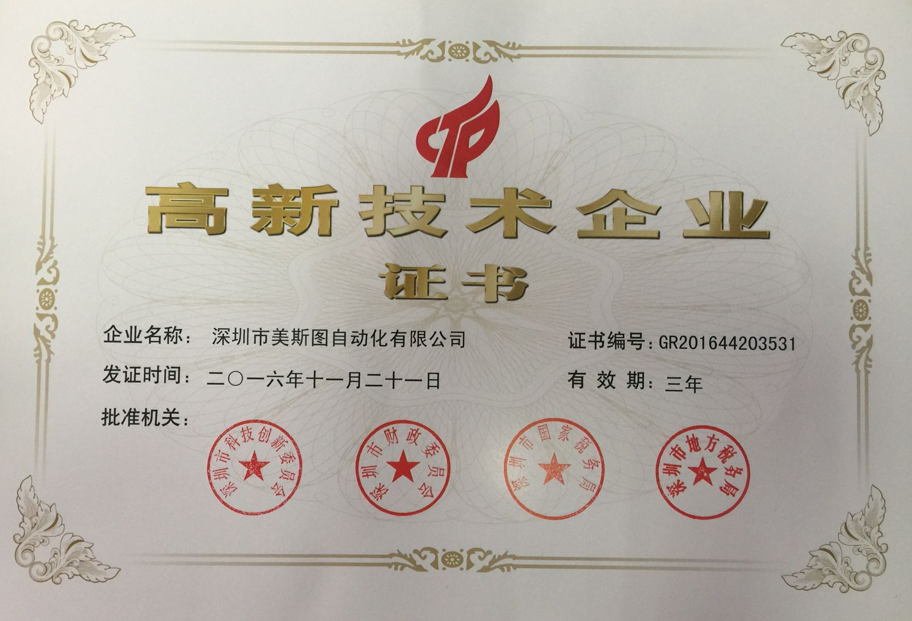 深圳市美斯圖自動化有限公司憑借專業(yè)的研發(fā)隊伍、雄厚的技術實力、持續(xù)的創(chuàng)新能力、科學的企業(yè)管理,順利通過深圳市科技創(chuàng)新委員會、深圳市財政委員會、深圳市國家稅務局及深圳市地方稅務局專家的層層評審順利通過了國家級高新技術企業(yè)認定。美斯圖公司最終喜獲“高新技術企業(yè)證書”。